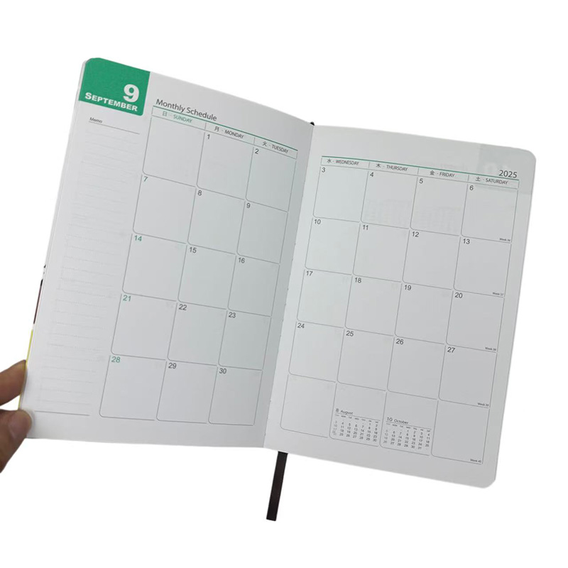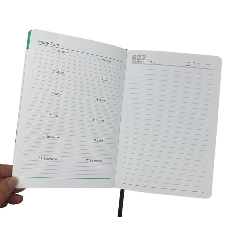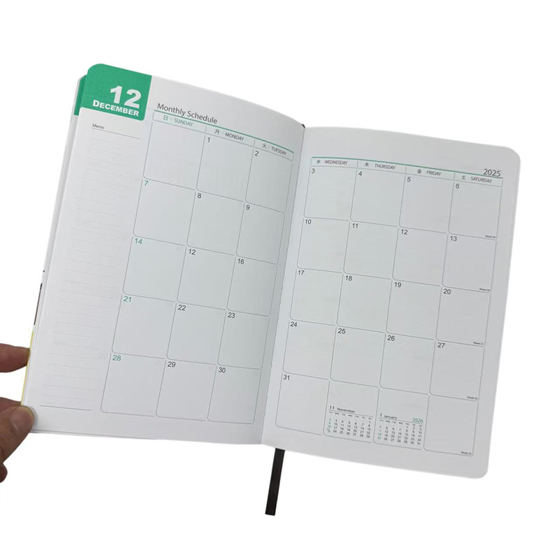 Inre sidlayout: Det finns en årlig plansida i början, som tydligt listar januari till december, så att du kan reda ut dina årliga mål och viktiga noder i förväg. Den månatliga plantabellen presenteras i form av en kalender, med tydliga datum och veckor markerade. Grid -designen ger gott om skrivutrymme för att spela in möten, möten, projektfrister, etc. Det finns också en minikalender för de föregående och nästa månaderna i månaden till höger, vilket är bekvämt för att snabbt kontrollera tidsföreningar; Med en kombination av inre sidor i horisontella linjer används den för att spela in inspiration, att göra-listor, detaljerade anteckningar etc. för att tillgodose olika skrivbehov, och memo nr, datum och andra fyllningsartiklar överst är praktiska för klassificering och spårningsinnehåll. Utrustad med ett svart bokmärkesband kan du snabbt hitta ofta använda sidor.