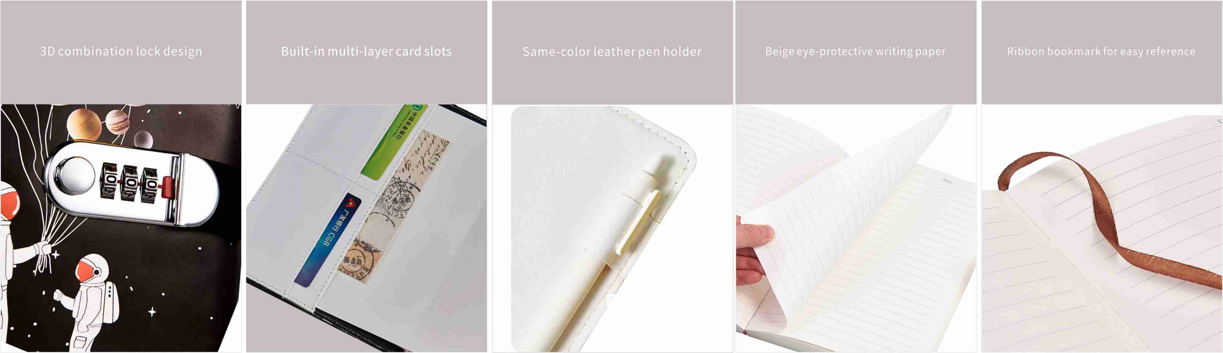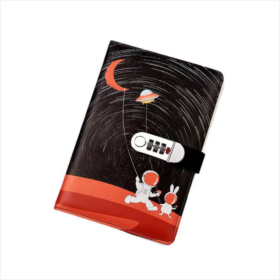Dagboknyckellås, denna dagbok är utrustad med ett metallkombinationslås, som stöder 0-9 tresiffrig kombination och har en mängd olika lösenordskombinationer. Du kan anpassa lösenordsfunktionen och omslaget är designat med ett rymdtema som täcker olika konstnärliga stilar. Dessa barnsliga och drömmande mönster gör inte bara att dagboken ser vacker ut, utan lägger också till en lycklig humör till dig när du spelar in, som om du startar ett fantastiskt rymdäventyr. Den har också funktionen att sätta in penna och innerficka, vilket är bekvämt för att lagra några små föremål.