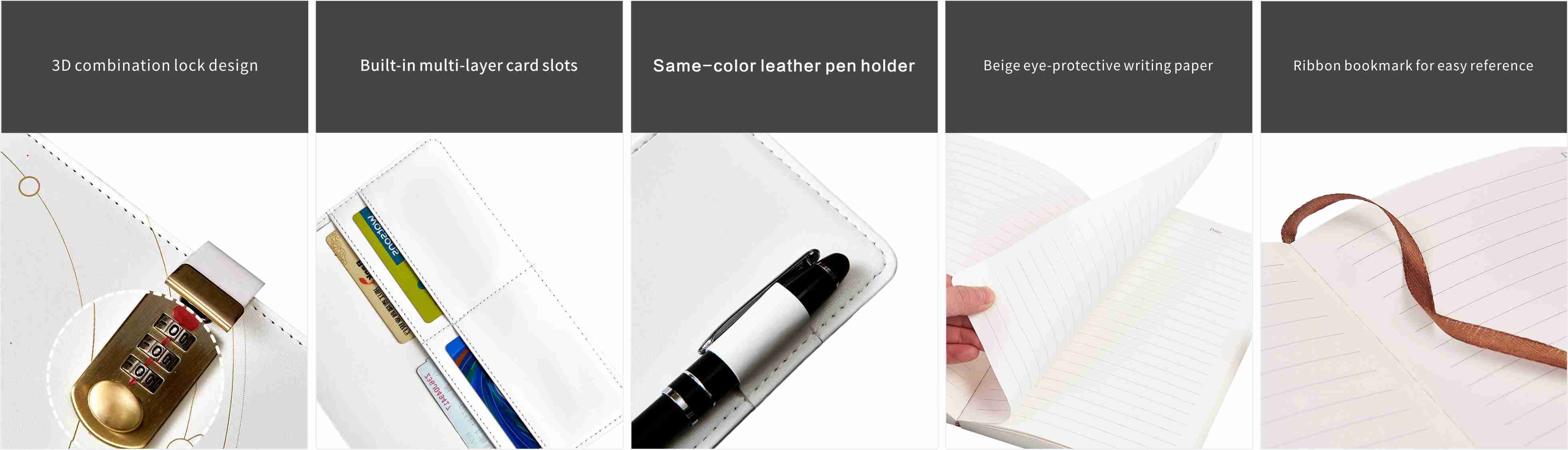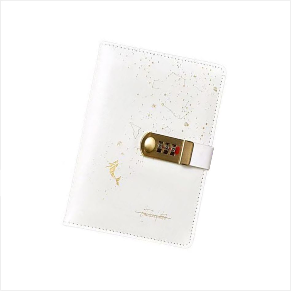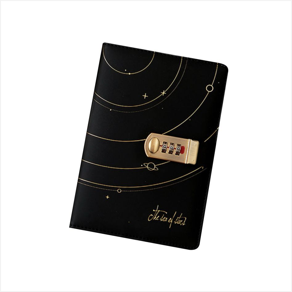 Omslaget till denna dagbok med nyckel är gjord av utsökt guldpläterad teknologi, som skisserar en bana som liknar en planetbana med enkla linjer, prickade med små prickar som stjärnor, som om den förtätade den mystiska natthimlen i bilden, tyst och full av fantasi. Den är utrustad med ett kombinationslås i gyllene metall, som styrs av ett tresiffrigt lösenord. Du kan ställa in ditt eget lösenord för att säkerställa att bara du kan öppna innehållet.