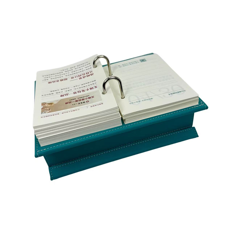 Det är tillverkat av högkvalitativt läder, känsligt för beröring och hållbar. Den inre sidan är tryckt med högkvalitativt daolinpapper, och skrivandet är inte bläckkänsligt. Den blå färgen visar avancerade, metallbindemedelsringsdesignen, smidig surfning, bekväm att lägga till eller subtrahera sidor och tillgodose behoven hos personliga poster.
