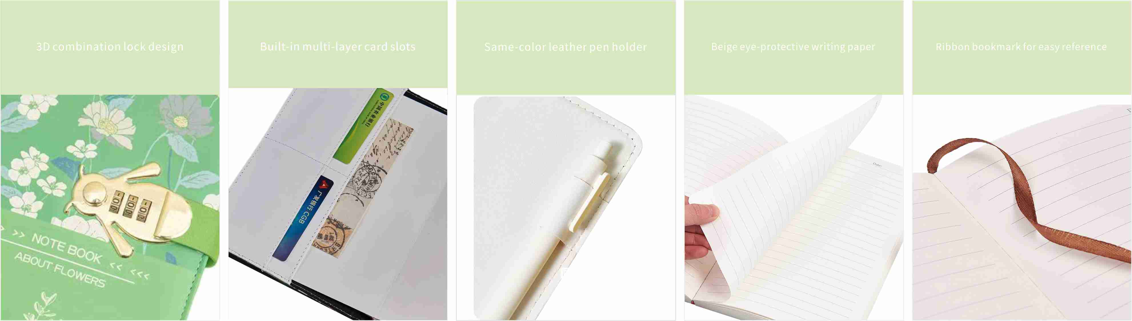 Vår lilla lösenordsbok har en färsk och elegant design, med blommiga element på omslaget och ett bi-format metallkombinationslås. Du kan ställa in ett unikt lösenord för att säkerställa att bara du kan öppna det och ge tillförlitligt skydd för din integritet och viktiga information. För att göra det bekvämt för dig att spela in inspiration när som helst, designade den eftertänksamt pennplatsen. En annan framträdande funktion är dess inre väskefunktion. Den här lösenordsboken är utrustad med flera kortutrymmen och inre fickor, vilket gör att du kan lagra bankkort, ID -kort, medlemskort, kvitton och andra objekt. Oavsett om du är i dagliga aktiviteter eller hanterar arbetsfrågor är dessa artiklar enkla att bära.